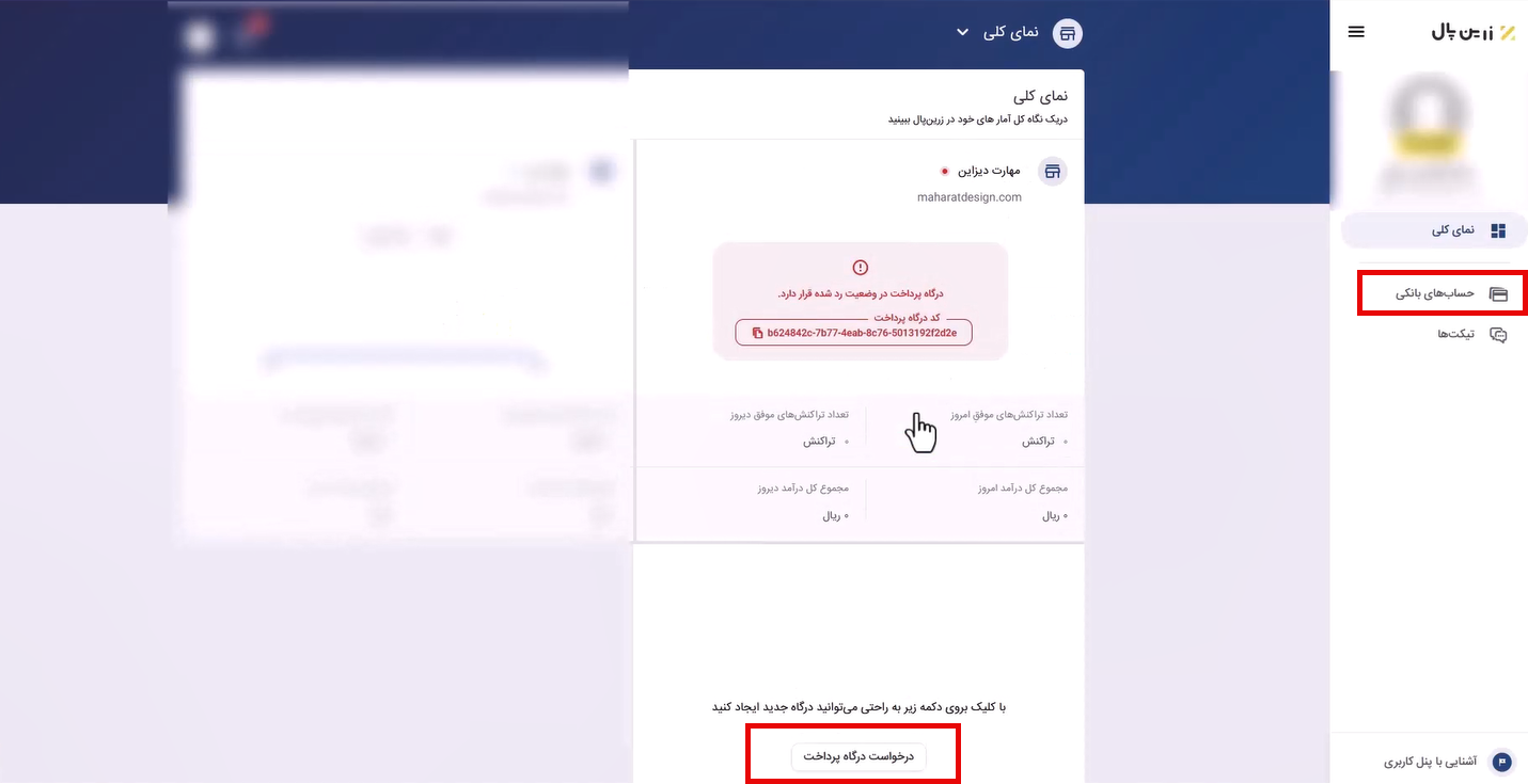 برای شروع نصب درگاه پرداخت غیر مستقیم از طریق زرینپال، ابتدا وارد قسمت «حسابهای بانکی» در پنل کاربری خود شوید و با کلیک روی گزینهی «افزودن حساب بانکی»، یک حساب فعال ثبت کنید. پس از تأیید حساب، روی گزینهی «درخواست درگاه پرداخت» کلیک نمایید تا صفحهی مربوط به ثبت درگاه باز شود.